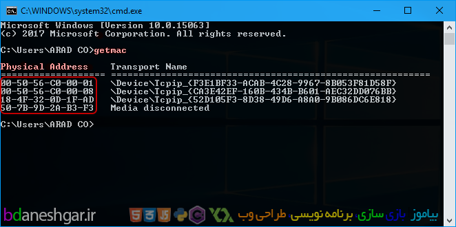 فرمان اول فرمان getmac است. این فرمان کاملاً برای به دست آوردن مک آدرس طراحی شده است. فرمان را بدون پارامتر تایپ کنید و کلید Enter را بزنید.