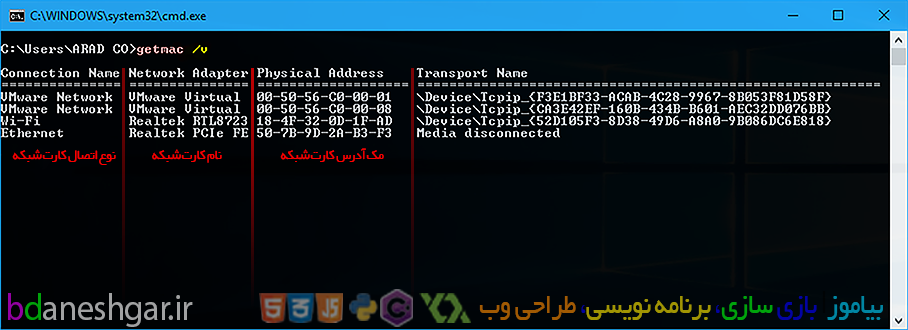مشاهده می کنید که مک آدرس های کارت های شبکه نوشته شده اند. اما با این حال نمی توان تشخیص داد که کدام مک آدرس برای کدام کارت شبکه می باشد و نوع اتصال آن چیست. برای اینکه بفهمید کدام MAC Address برای مربوط به کدام کارت شبکه است می توانید از پارامتر v استفاده کنید. حال فرمان getmac را با پارامتر v وارد نمایید.